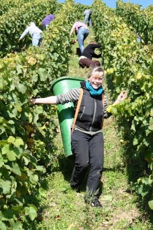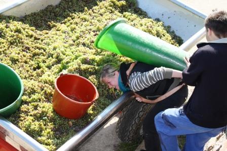Der nächste Tag war der lang ersehnte Tag der Weinlese. Mit der Winzerfamilie inklusive Hund Frodo, sowie vielen bekannten Helfern wurden wieder Trauben im Berg Roseneck von den Händen der Auszubildenden aus Meck-Pom gelesen.