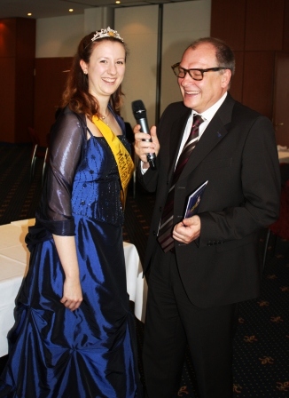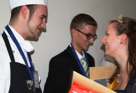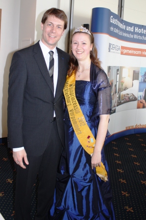 Eigentlich seit Jahren trifft die amtierende Weinprinzessin hier Kollegen aus der Berufsschule und Auszubildendenvertreter des ganzen Landes, um nach einem tollen Menü an einem der Bewertungstafeln bei der Siegerehrung dem Vertreter der IHK und Präsident Guido Zöllick zu unterstützen.