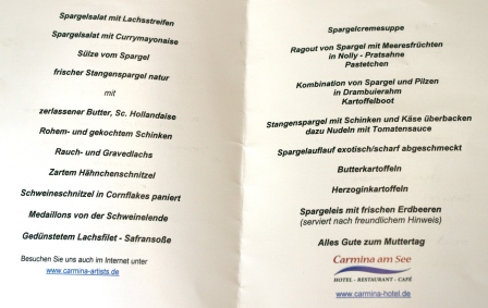 Das erste Spargelessen im Hotel Carmina am See mit fast 60 Gästen hatte den zum Muttertag würdigen Rahmen durch unsere Weinprinzessin 2012. Die "Königin der Gemüse" in vielen Variationen und mit vielen Beilagen, die Gäste und besonders die Mütter zu Ihrem Ehrentag begrüßt und empfangen durch die Weinprinzessin Mecklenburg Vorpommern, dass war toll.